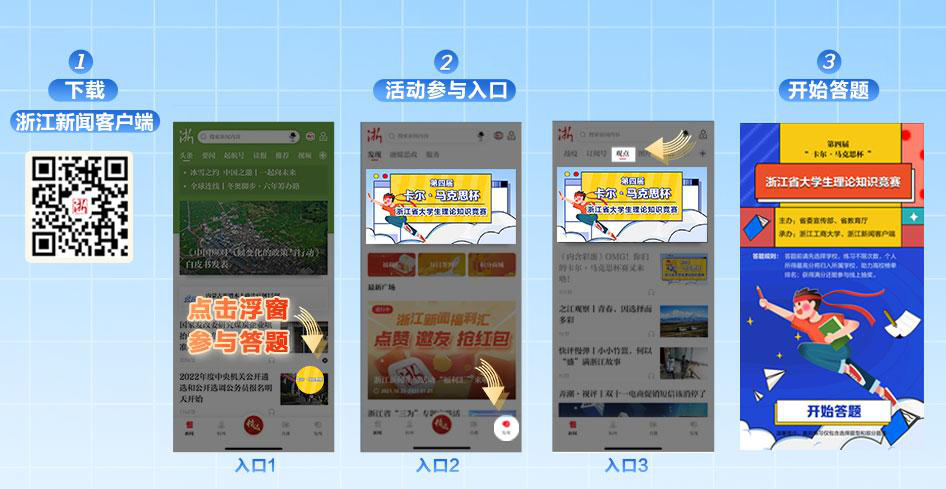 初赛的操作初赛在浙江新闻客户端上进行,请参赛学生下载浙江新闻客户端并注册登录。点击头条浮窗、“活动”按钮或“思想”频道,根据提示进行注册和答题。具体方式如下: