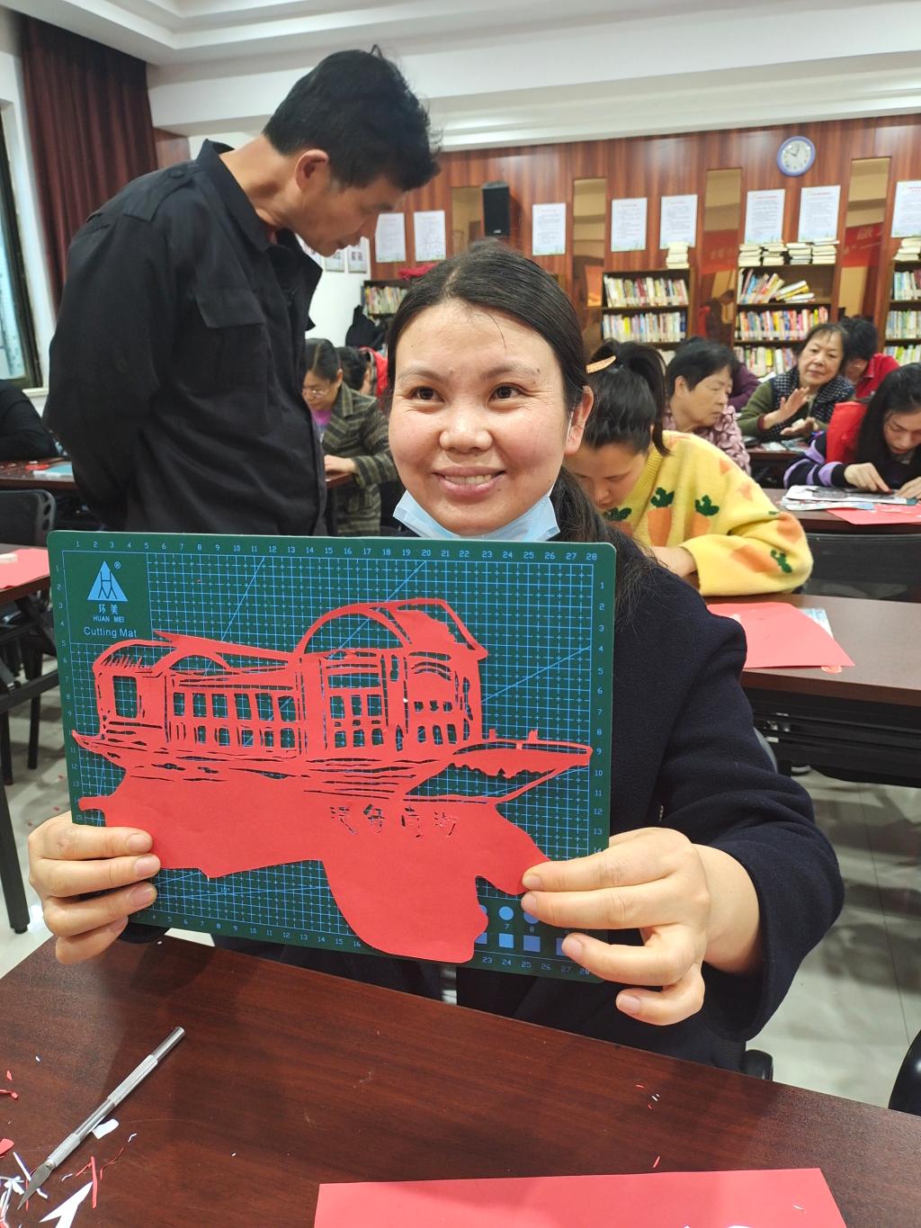 紧接着,党员义工带领社区居民学习传统剪纸技艺和操作方法。一把刻刀、一张红纸、一双巧手,一幅幅栩栩如生的“红船精神”剪纸作品讲述着红色故事,带领大家游走于红色历史与传统文化的广阔天地,进一步发扬“红船精神”,学党史,悟思想,根植家国情怀。随后,大家一同观看了建党一百周年短片《百年恰是风华正茂》,弘扬革命精神,传承红色基因。