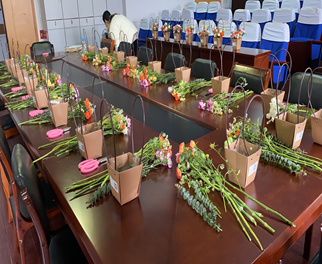 花艺师首先为老师们介绍了花艺的基本理论,介绍如何通过一定技术手法,将花材排列组合或者搭配使其变得更加的赏心悦目,表现一种意境或宏观场面,体现自然与人以及环境的完美结合,形成花的独特语言,让观赏者解读与感悟。花卉师指出艺术是人们表现自然的生命、展示自然的魅力以及人的内心世界对自然、人生、艺术和社会生活体悟的媒介,是人们借助于自然界的花草作为修身养性、陶冶情操、美化生活的一种方式。花艺体验整个过程体现了形式与精神的相互统一。