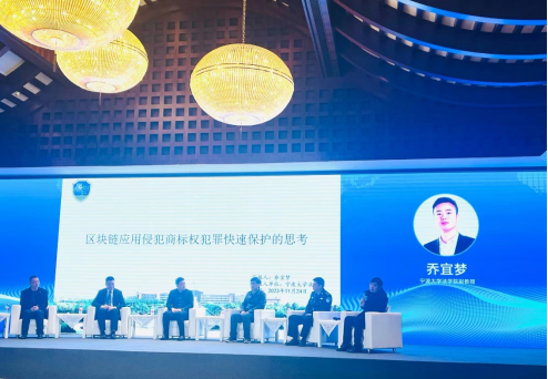 教师乔宜梦副教授在会议论坛“假冒注册商标犯罪的快速保护、协同保护”主题中做“区块链应用侵犯商标权犯罪快速保护的思考”的主题发言,其从打击侵犯商标权犯罪的特征和实践难点入手,分析了在打击侵犯商标权犯罪中应用区块链技术的可能性、优势、具体步骤与制度构建。