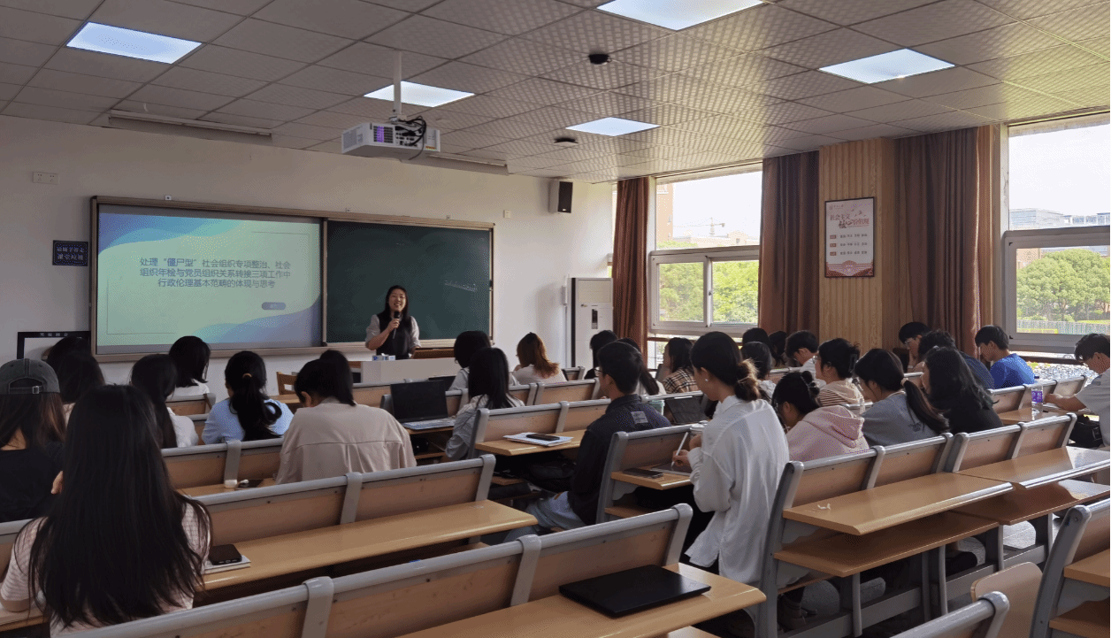 5月29日,基层社会治理组邀请宁波市鄞州区社会组织创新园(社会组织党群服务中心)党群部部长唐冬走进《行政伦理学》课堂,为21级行政管理本科生带来了一场别开生面的“课程思政+行政伦理”实务讲座,讲座主题为《处理“僵尸型”社会组织专项整治、社会组织年检与党员组织关系转接三项工作中行政伦理基本范畴的体现与思考》。此次讲座旨在将思政理论、行政伦理理论与治理实践紧密结合,深入探讨社会组织行政管理领域的道德伦理挑战与责任,为未来的公共部门从业人员塑造坚实的价值观和行为准则。