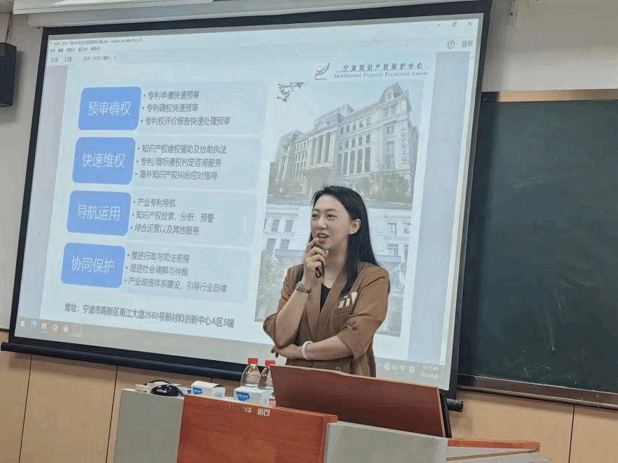 陆老师还详细介绍了宁波知识产权保护中心的工作情况,特别在海外知识产权纠纷应对和维权方面所做的工作:宁波知识产权中心是首批国家海外知识产权纠纷应对指导中心地方分中心,筹建完成符合宁波本地发展需求的海外知识产权纠纷指导专家库,依托全球数据库资源优势,及时排查海外知识产权纠纷信息,积极提供海外纠纷应对指导,重点案件指导率为100%。