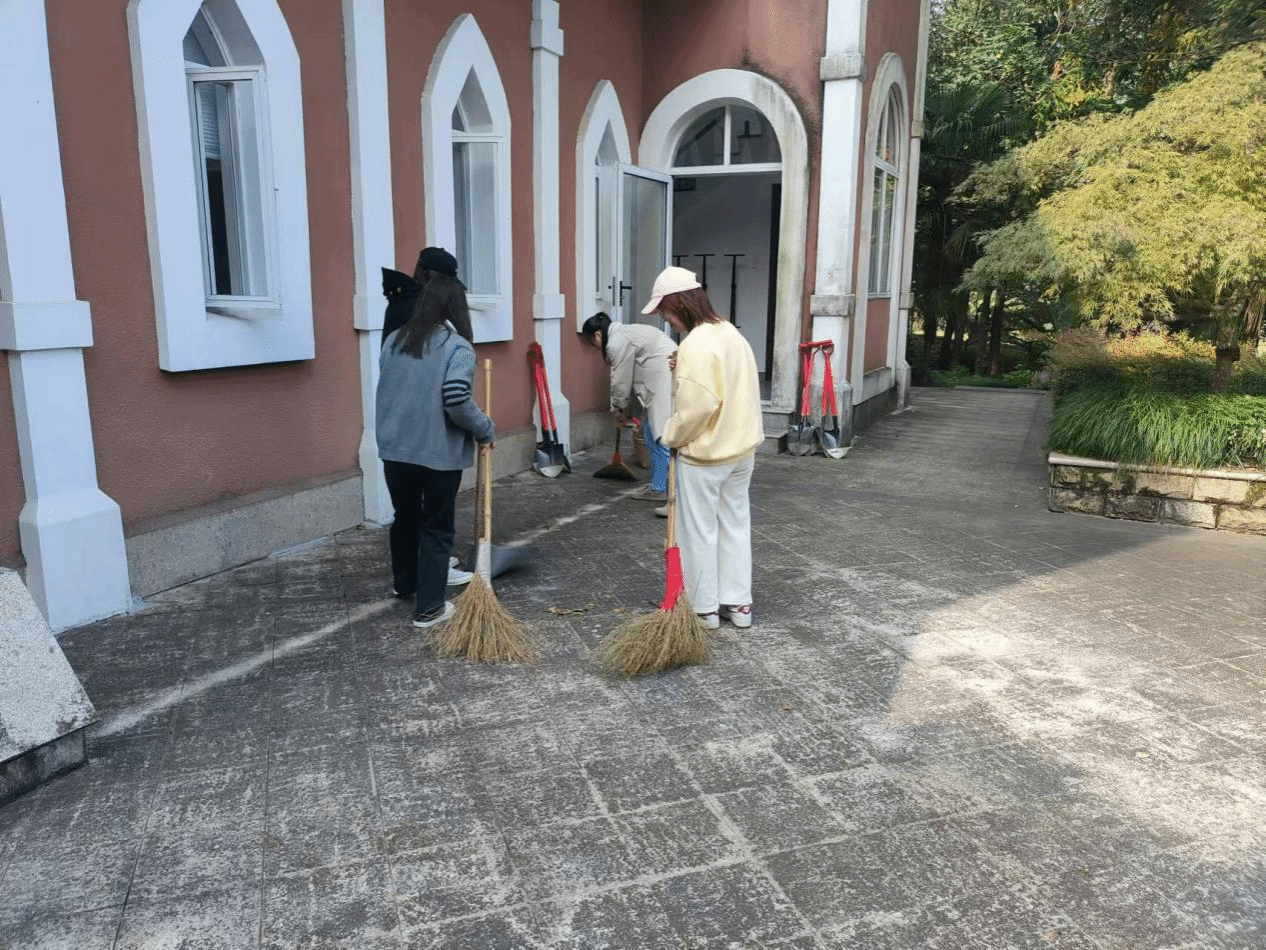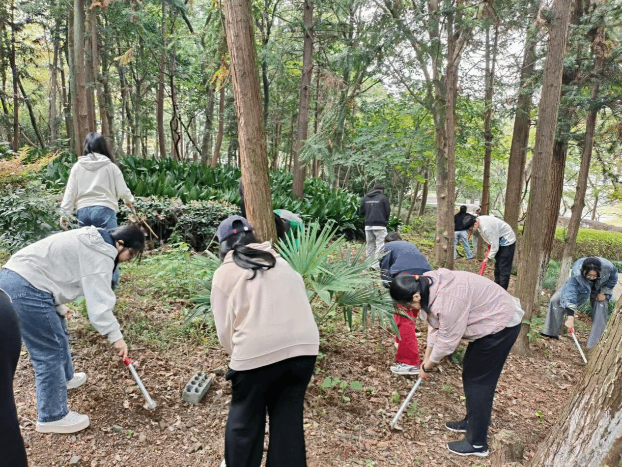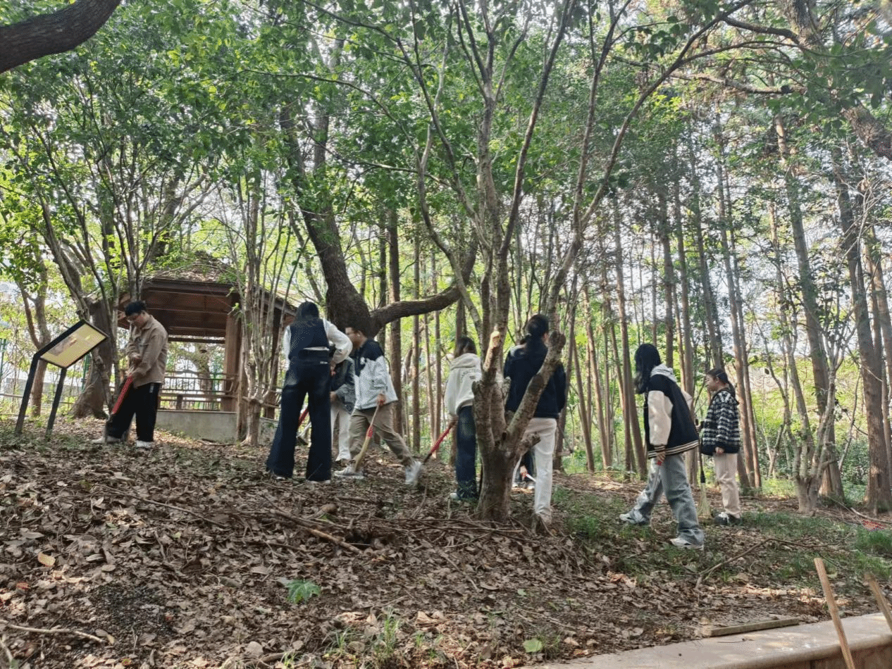 本次劳动分为三组,一组学生前往后山清理枯枝杂草,一组学生在基地门口清扫落叶,一组学生在湖边清理垃圾。