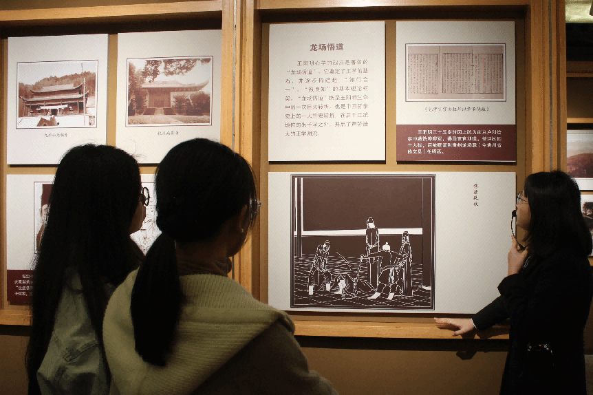 第二站,同学们前往王阳明先生的故居进行参观,共同踏上了一段探寻历史足迹、学习“心学”思想之旅。在讲解员的带领下,师生们一起参观了瑞云楼、王阳明书房及卧室、王阳明弟子事迹陈列馆等,了解王阳明的生平事迹和思想成就。
