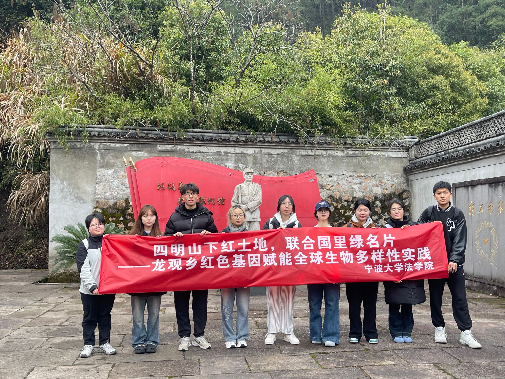 学生在夏雨教授、张亮教授的带领下,赴宁波市海曙区龙观乡开展实地调研。龙观乡党委书记全程陪同,双方围绕生物多样性保护机制、绿色低碳发展等议题展开深入交流。