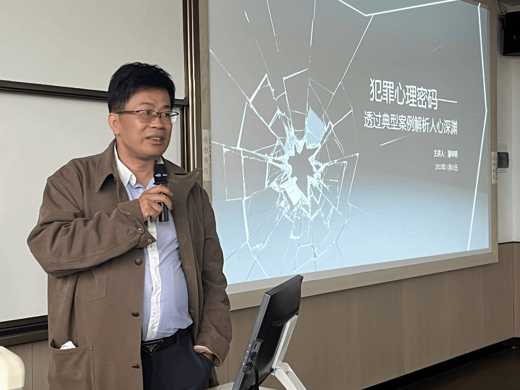 副教授、浙江京衡(宁波)律师事务所主任潘申明律师以《犯罪心理密码——透过典型案例解析人心深渊》为题,为在场师生带来一次深刻而生动的犯罪心理学讲授。潘教授结合其丰富的检察实务经验与法学研究背景,通过一系列真实案例,深入剖析犯罪行为的心理动因,揭示了犯罪心理学在法律实务与个人生活中的重要价值。