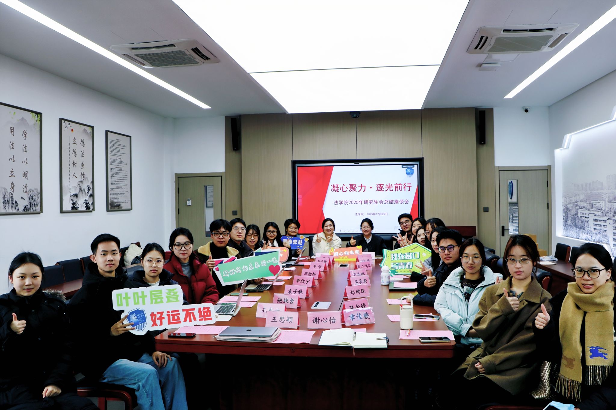 2025年研究生会总结座谈会在学院202会议室举行。会议以“凝心聚力,逐光前行”为主题,全面回顾过去一学期工作,交流经验,展望未来。院党委副书记谢果凰、院研究生会秘书长戴丽莉及研会新老干部代表20余人出席会议。