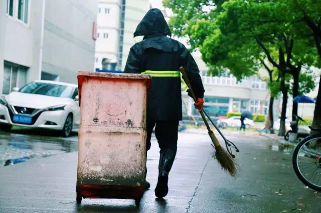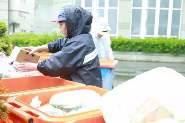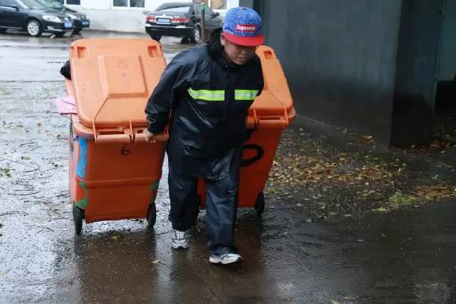 狂风肆虐还夹杂着密集的雨的早晨,当我们走到本部公寓垃圾场时,发现早有一个身影在风雨中的这个狭小的区域内,挥动着扫把进行着辛苦的清洁工作。