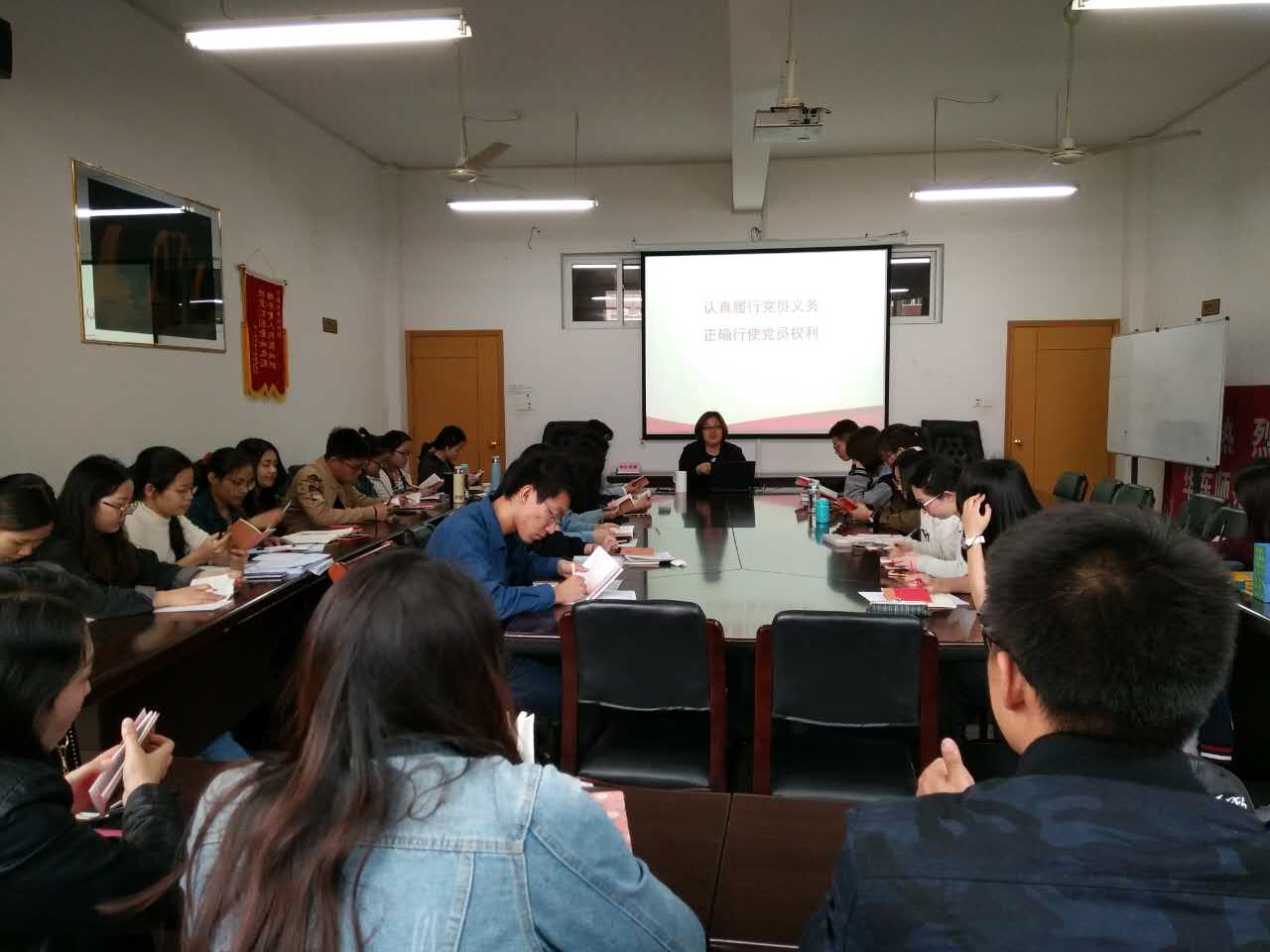 党委组织员汪丹在学院会议室为第三十四期入党积极分子主讲“中国共产党的义务和权利”为主题的党课。