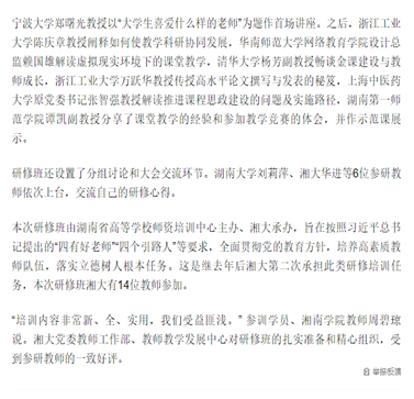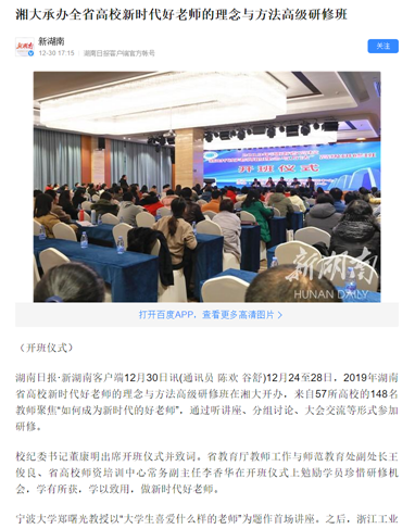 湖南日报客户端官方帐号“新湖南”于12月30日发布《湘大承办全省高校新时代好老师的理念与方法高级研修班》一文。
