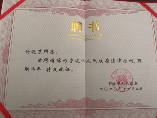钭晓东院长、潘申明副教授获聘宁波市政府法律顾问,市长裘东耀作讲话,市政府各部门一把手出席会议。