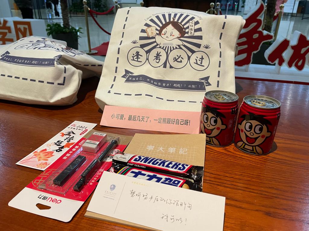 定制“逢考必过”帆布包、考试所需的各种文具考研文具套装、学院专属考研书签、写着“想听努力后的你说那句,我可以!”等祝福语的考研小纸条,到象征福气的旺仔牛奶和“横扫一切”的士力架,再到装袋、派送,整个过程都承载了学院对考研学子满满的鼓励与美好的祝愿。