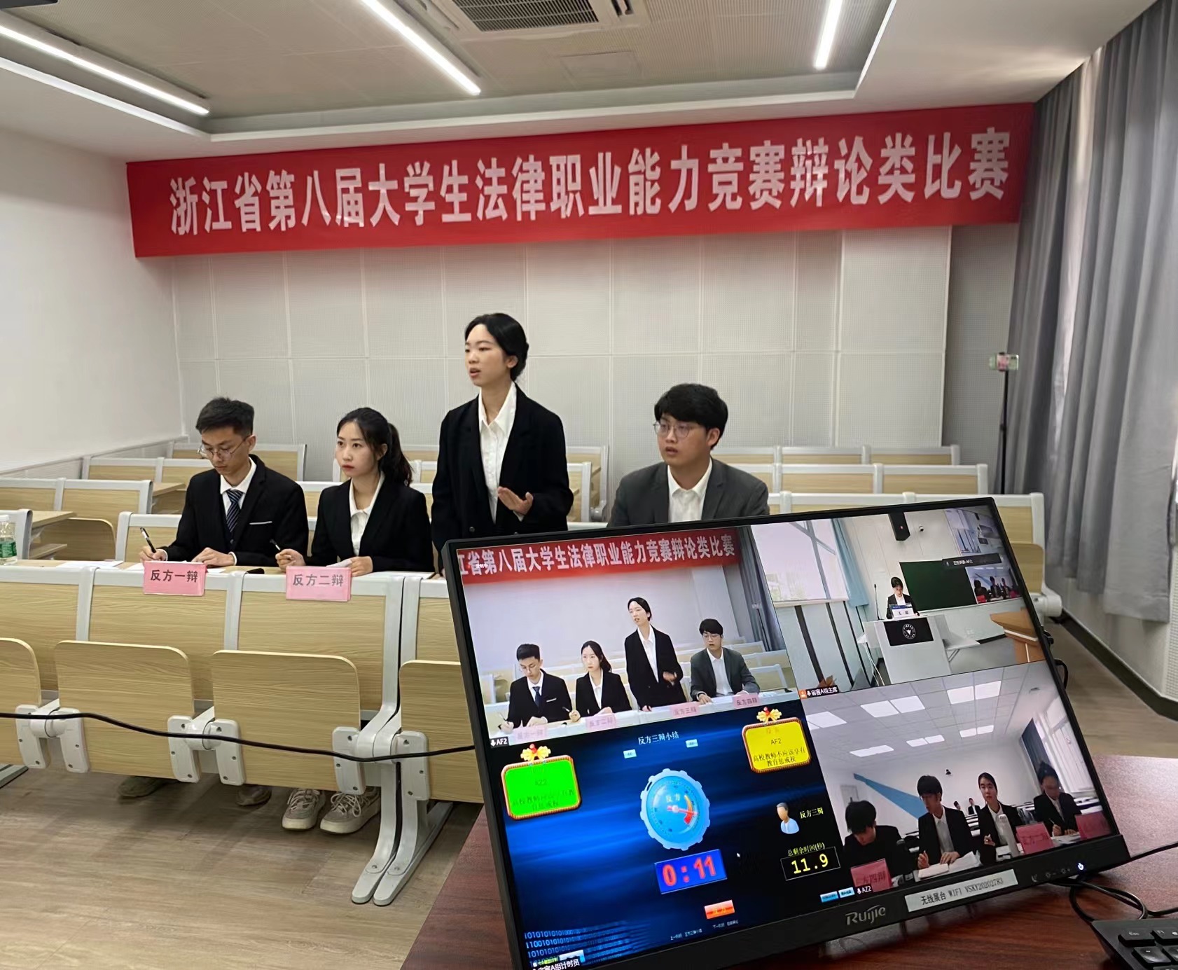 为期两天的比赛中,辩手们围绕“公众人物的隐私权是否应该受到限制”“虐待动物应当不应当立法追责”“高校教师是否应当享有教育惩戒权”等辩题展开激烈的辩论。据悉,浙江省大学生法律职业能力竞赛是国内首创且为目前国内唯一常规举行的综合类法律专业赛事,也是浙江省专业性最强、赛事规模最大、最具权威的法科大学生科技竞赛,旨在培养具有创新精神和实践能力的卓越法律人才,促进浙江省法科大学生综合素质的全面提升,提高人才培养质量,活跃校园气氛、开拓学生思想,展现大学生朝气蓬勃、积极向上的精神风貌,促进法学学科教学改革,在整体上推动浙江省法学教育的发展。