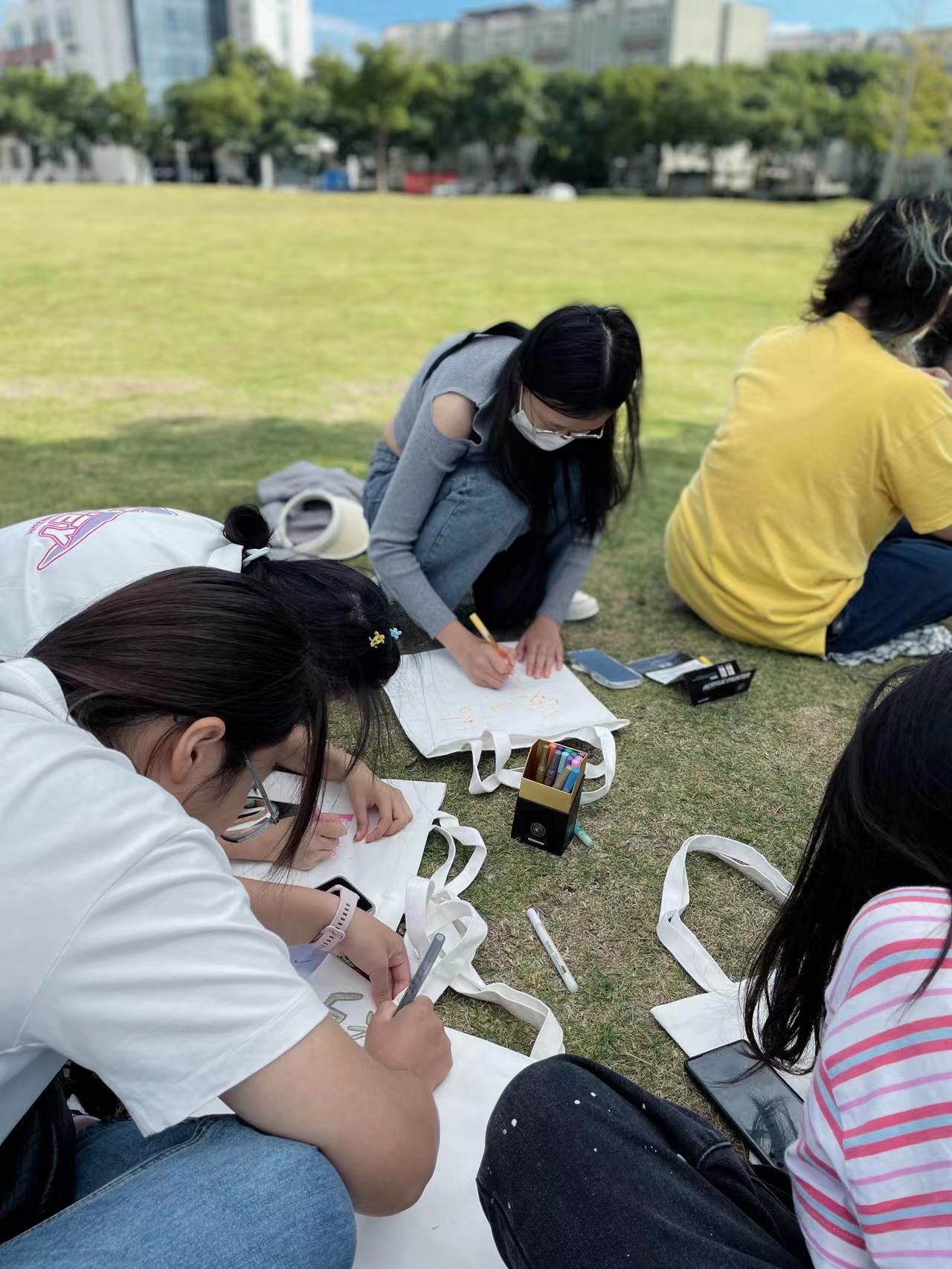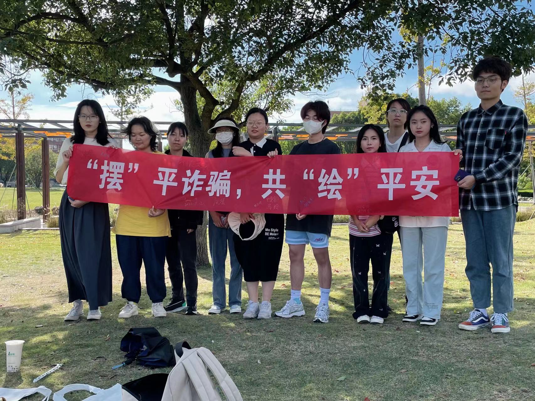 在本部有思广场及大草坪开展“‘摆’平诈骗,共‘绘’平安”反诈主题活动。同学们通过在帆布包上绘画标识和标语的方式,展现青年学生的反诈精神。