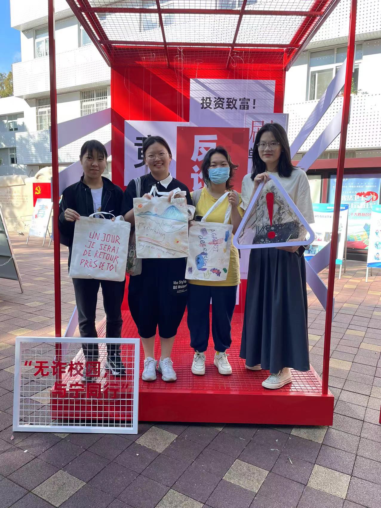 绘制活动结束后,同学们受益匪浅。2022级的陈嘉煜同学说:“创作结束,恰是宣传反诈知识的开始。我希望能够通过帆布包的日常使用,在警示自己防范诈骗的同时,也给身边的同学、亲友带去正面影响。