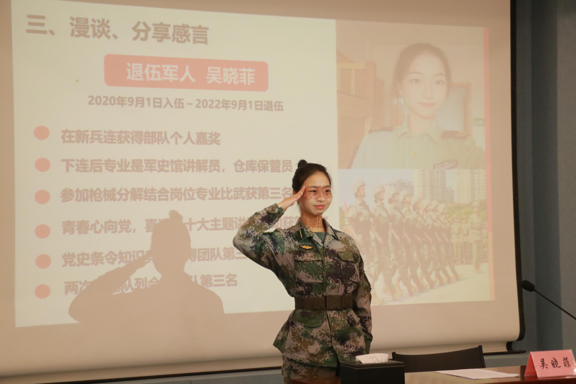 首先,吴晓菲同学真诚地向大家表达了她对大学参军的看法,介绍了进入部队之后的日常生活。从吴晓菲同学进行队列训练、写思想报告的日常以及担任军史馆讲解员、仓库保管员的特殊经历中,不难感受到她对自身的严格要求和对于自己要做什么,该做什么的深刻思考。她的分享让同学们对自我的认知和追求更加清晰和坚定。