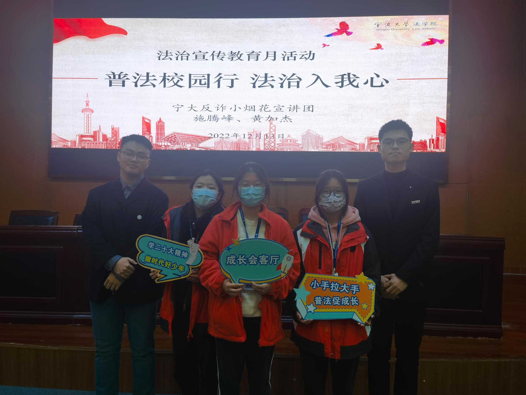 青年普法宣讲团——“宁大反诈小烟花”团队的21级法律硕士黄加杰、梁蔚程以及22级法律硕士施腾峰、王富达进行主讲,他们以“普法校园行,法治入我心”为主题,通过“法律实践与法治理论相结合”、“公民权利与时代使命相呼应”、“分享与互动相配合”的方式进行普法宣讲。