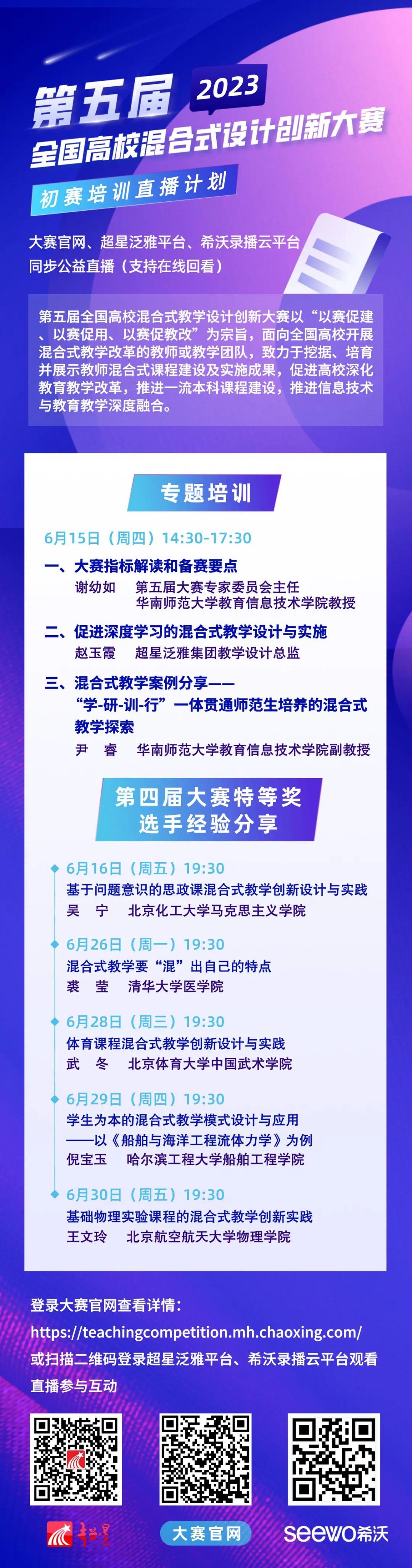 2.大赛培训:第五届大赛组委会将在大赛官网开放培训资源,教师可根据需求自主在官网注册参加学习(免费),大赛配套培训包括初赛、复赛、赛后优秀案例推广,具体培训安排及培训资源见大赛官网通知。