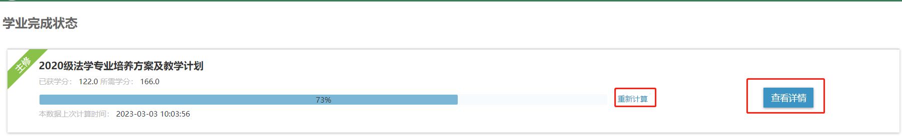 登陆网上办事大厅-搜索“学业完成查询”-点击“重新计算”-点击“查看详情”,进入界面后,再次点击“查看详情”可以查看详情的审核报告。
